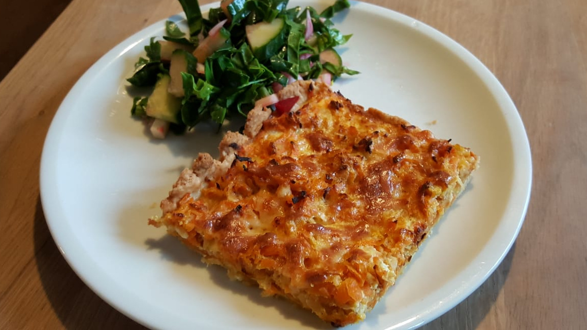 1. Das Weizenvollkornmehl mit dem Kümmel und dem Meersalz in einer Backschüssel mischen. Die Butter in Flöckchen darüber verteilen und mit den Fingerspitzen fein verkrümeln. Den Quark dazugeben und alles mit dem Knethaken der Küchenmaschine zu einem geschmeidigen Teig verkneten. Eine Springform von 24 cm einfetten. Den Teig ausrollen. Die Form damit auslegen und einen Rand von 2 ½ - 3 cm hochziehen. 30 Min. ruhen lassen.