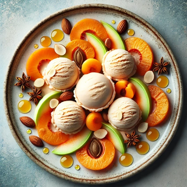 Aprikoseneis noch einmal gut durchrühren, zu Kugeln formen und in die Mitte der Teller setzen. Das Eis lässt sich auch in der Eismaschine zubereiten. Anstelle der Aprikosen können Sie auch reife Pfirsiche verwenden.